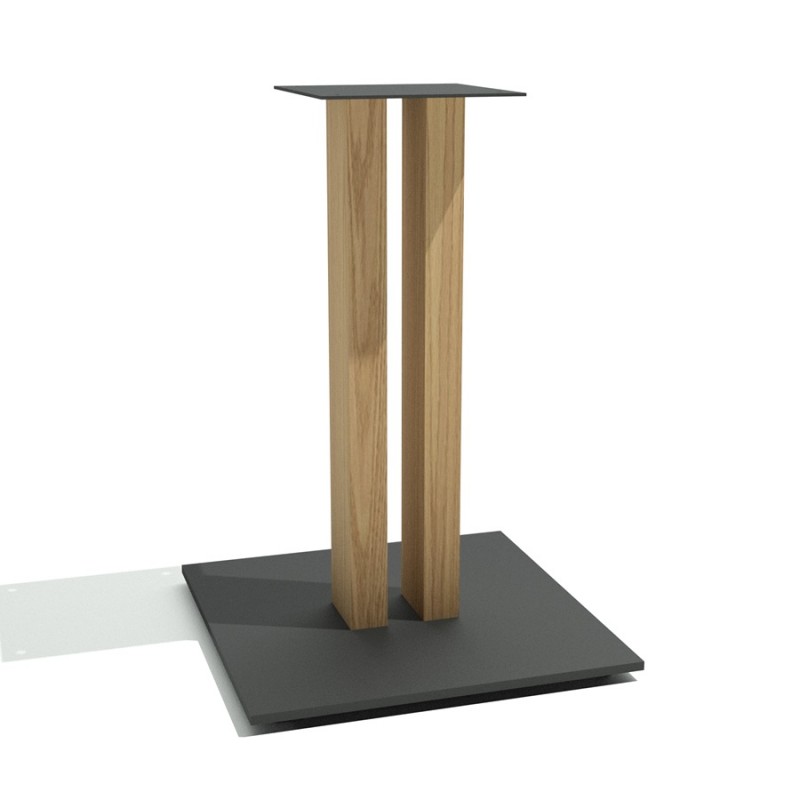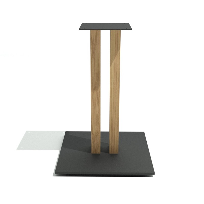 Base pedestal Almita para mesas de restaurantes en exterior o interior, fabrica en placa fenolico 12mm, con postes de wpc tipo madera, placa superior acero 30x30 de 4.5 mm, acabado metal pintura electro estatica negro mate texturizado.