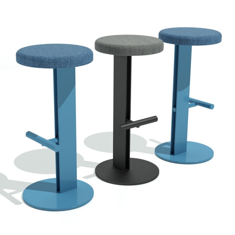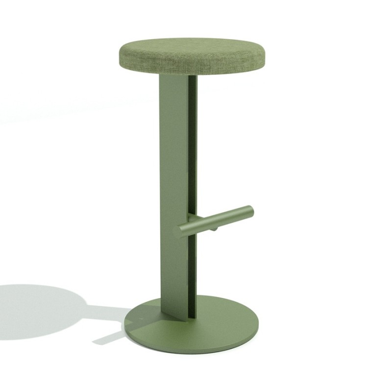 Banco Richi para Bar, fabricado en base de placa de acero de 1/4" con poste central en solera de acero, metal acabado en pintura electro estática y pintura a color de poliuretano, asiento tapizado en espuma de poliuretano, tapiz de vinil marca easy decor.