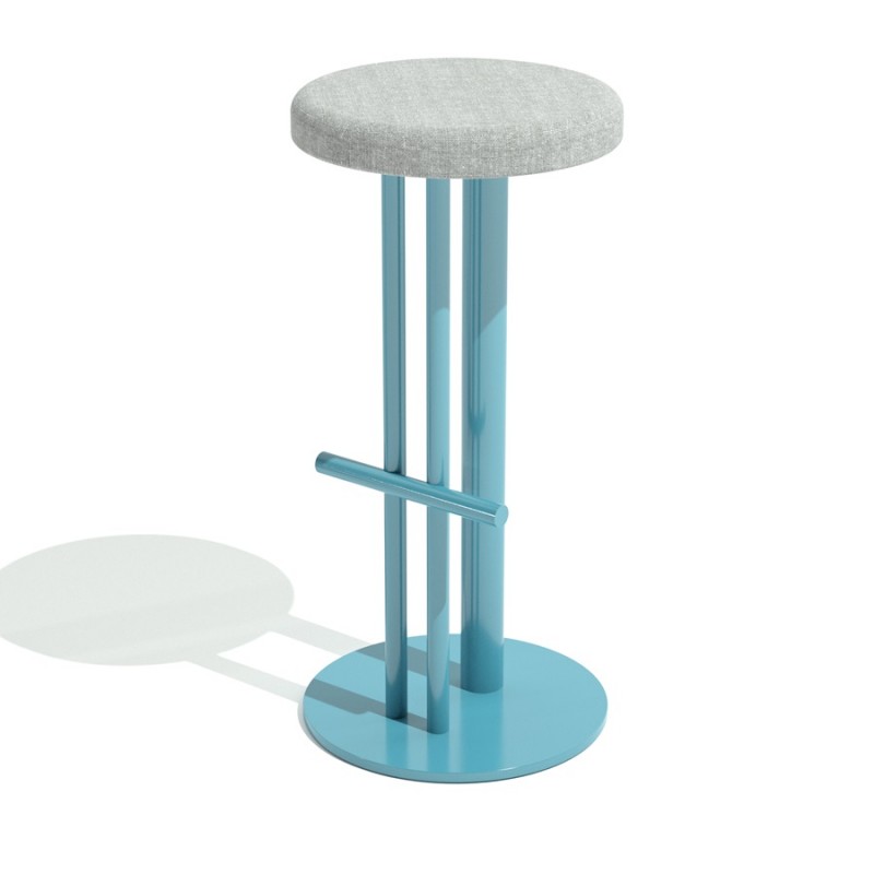 Banco Richi para Bar, fabricado en base de placa de acero de 1/4" con poste central en solera de acero, metal acabado en pintura electro estática y pintura a color de poliuretano, asiento tapizado en espuma de poliuretano, tapiz de vinil marca easy decor.
