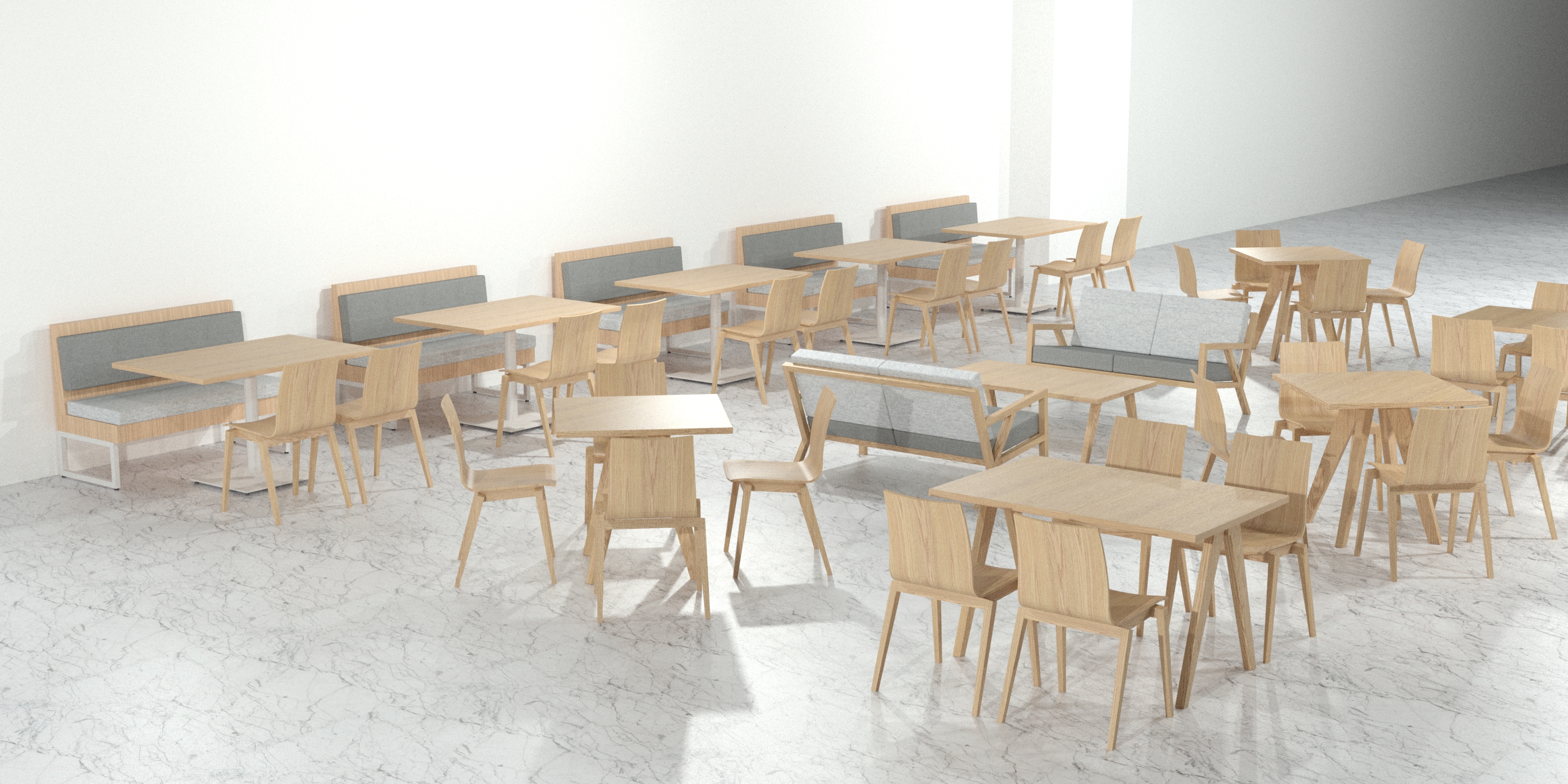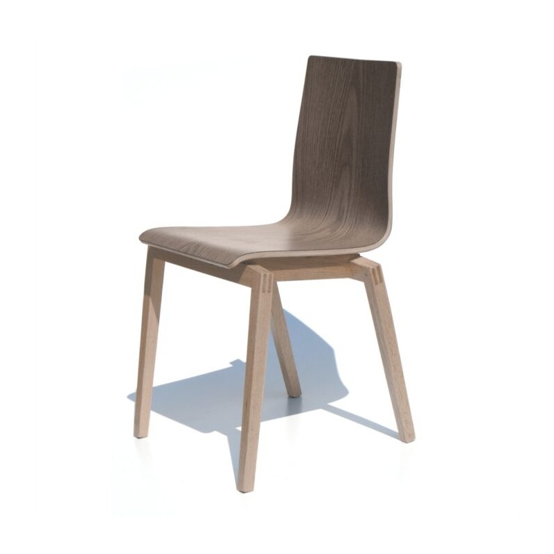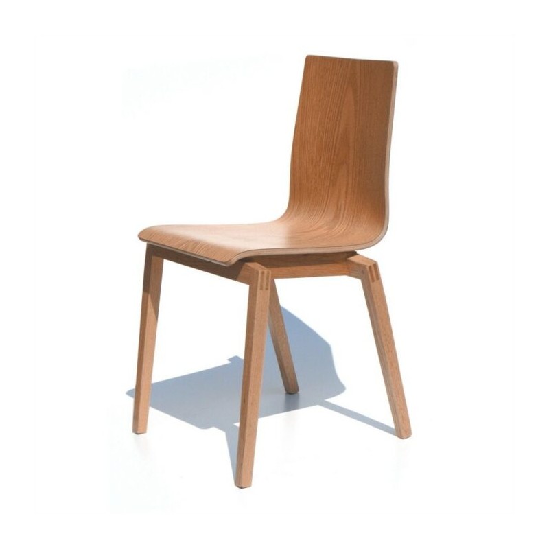 Silla de madera, fabricada en madera de encino, con asiento y respaldo integrado en madera contra chapedad y terminado en laminado plastico, base en madera solida ensamblada a media madera.